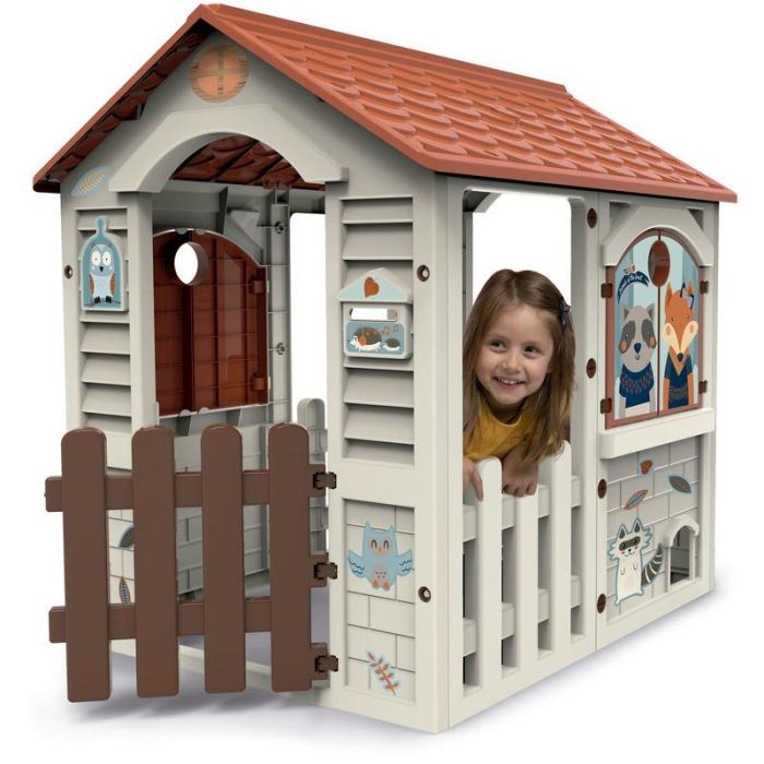 Casita del Bosque para imaginar y aprender jugando. La Casita incluye Barbacoa trasera, ventanas abatibles, buzón para cartas y una gatera para que las mascotas también puedan visitar la pequeña casa de campo. Casita de plástico de gran resistencia, fácil montaje y apta tanto para interior como para exterior. Medidas 84 x 103 x 104 cm. A partir de 2 años.