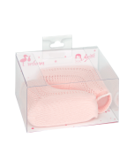 Elba tiene 45 cm, sus extremidades son de vinilo y su cuerpo suave (no tiene el genital marcado). Incluye un bonito vestido rosa con cuello, gorro y calcetines. Elba lleva su chupete fácil de ajustar a todas partes. La suave manta está incluida.