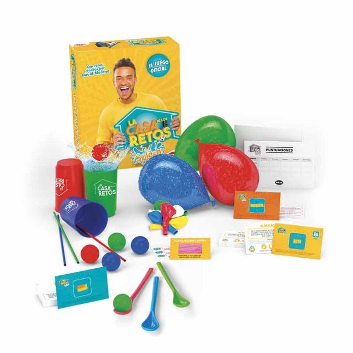 Participa con tu familia en el programa más loco de la tv desde tu casa, desde el jardín, desde el parque o la piscina con el juego oficial de La Casa de Los Retos ¡Splash!. Tú y tu familia formáis un gran equipo, por eso sed ágiles adivinando las preguntas y participad en los retos más ¡Splash! incluidos en el juego. Ganad los retos a vuestros adversarios y acumular puntos para… ¡Proclamaros campeones de La Casa de los Retos! Incluye: 20 Cartas de Preguntas con 60 preguntas, 15 Cartas de Retos, 7 Cartas de Bloqueo, 1 Carta Decodificadora, Bloc de notas para respuestas, Bloc de notas Ranking de la partida, 12 globos de agua, 6 bolas, 3 pajitas reutilizables, 3 cucharillas de plástico reutilizables, 3 vasos.